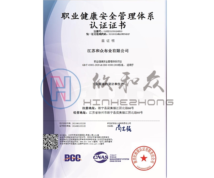 职业健康安全管理体系认证证书